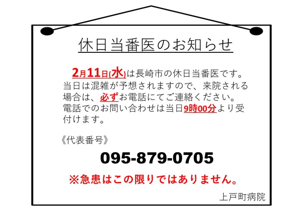 休日当番医のお知らせ:2月11日(水)
